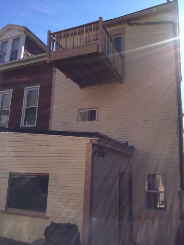 Exterior work is going on as well. The new siding is going up on the back of the house! I decided to use Hardie Plank siding. It's a great alternative to wood. I chose the Hardie color of cobblestone for the siding with white trim. Here is a pic from before. Notice the very dangerous balcony. The house inspector refused to step on it.